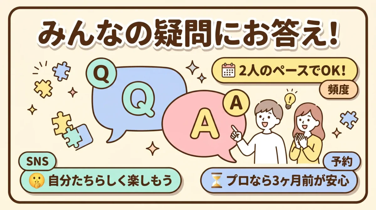 ここでは、カップル写真の撮り方についてよく聞かれる質問にまとめて答えていきます。
